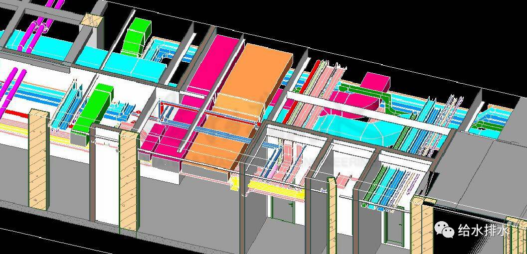 由于本項(xiàng)目土建結(jié)構(gòu)復(fù)雜,機(jī)電設(shè)備專業(yè)管線布置空間也非常緊張,許多管線綜合工作中細(xì)節(jié)方面的問題,若采用傳統(tǒng)CAD二維圖紙模式進(jìn)行分析及解決,將變得非常困難,甚至有些局部很難通過二維圖紙發(fā)現(xiàn)問題,這些問題若在施工階段才發(fā)現(xiàn),輕則拖慢施工進(jìn)度,重則造成返工。