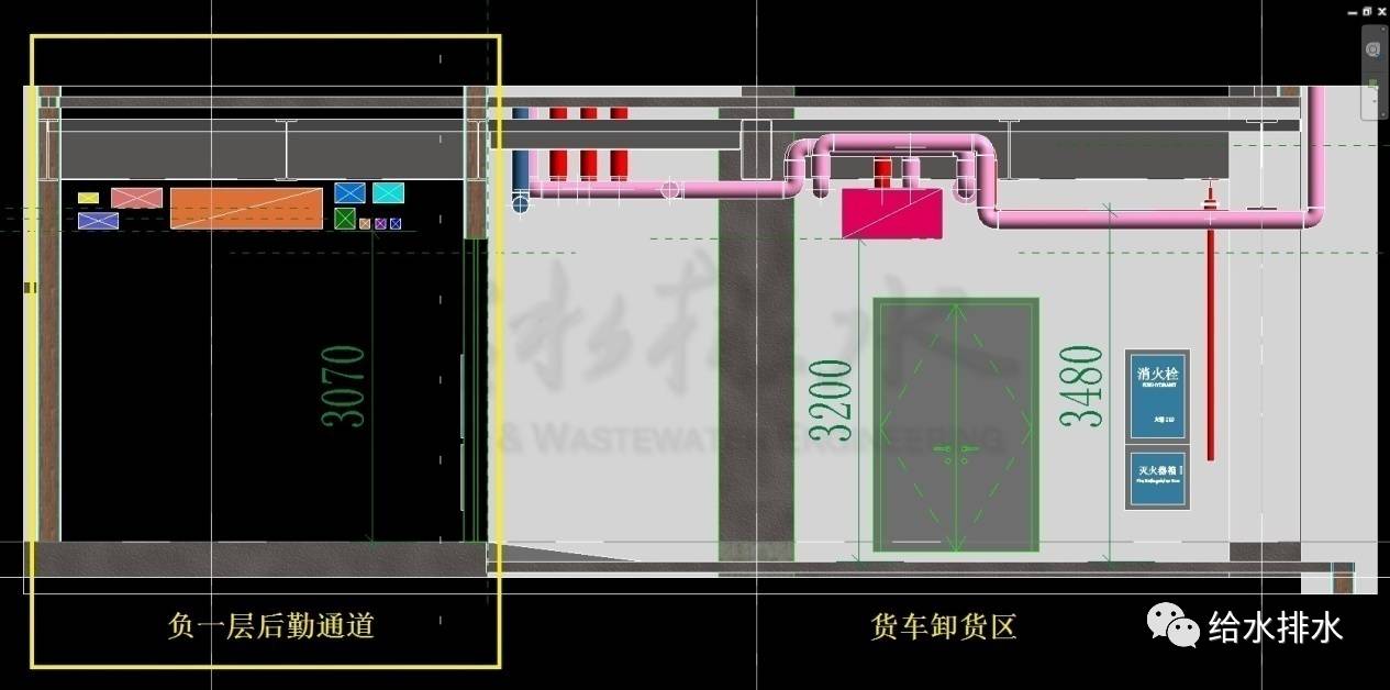 為滿足甲方對(duì)凈高的超常規(guī)要求,后勤通道中段給排水專業(yè)消防管線需要更改走向,一部分從負(fù)一層隱蔽的地方設(shè)豎管上負(fù)一夾層,再?gòu)呢?fù)一層展廳頂上的鋼結(jié)構(gòu)桁架間敷設(shè)管道作為過渡,再找適當(dāng)位置作豎管回到負(fù)一層后勤通道;另一部分調(diào)至貨車車道及卸貨區(qū)上方。而后勤通道中段僅留必要的風(fēng)管,且風(fēng)管盡可能壓扁,強(qiáng)弱電分置于風(fēng)管兩側(cè),水專業(yè)僅留自動(dòng)噴水滅火系統(tǒng)支管,最后勉強(qiáng)能滿足甲方在此區(qū)域的凈高要求。